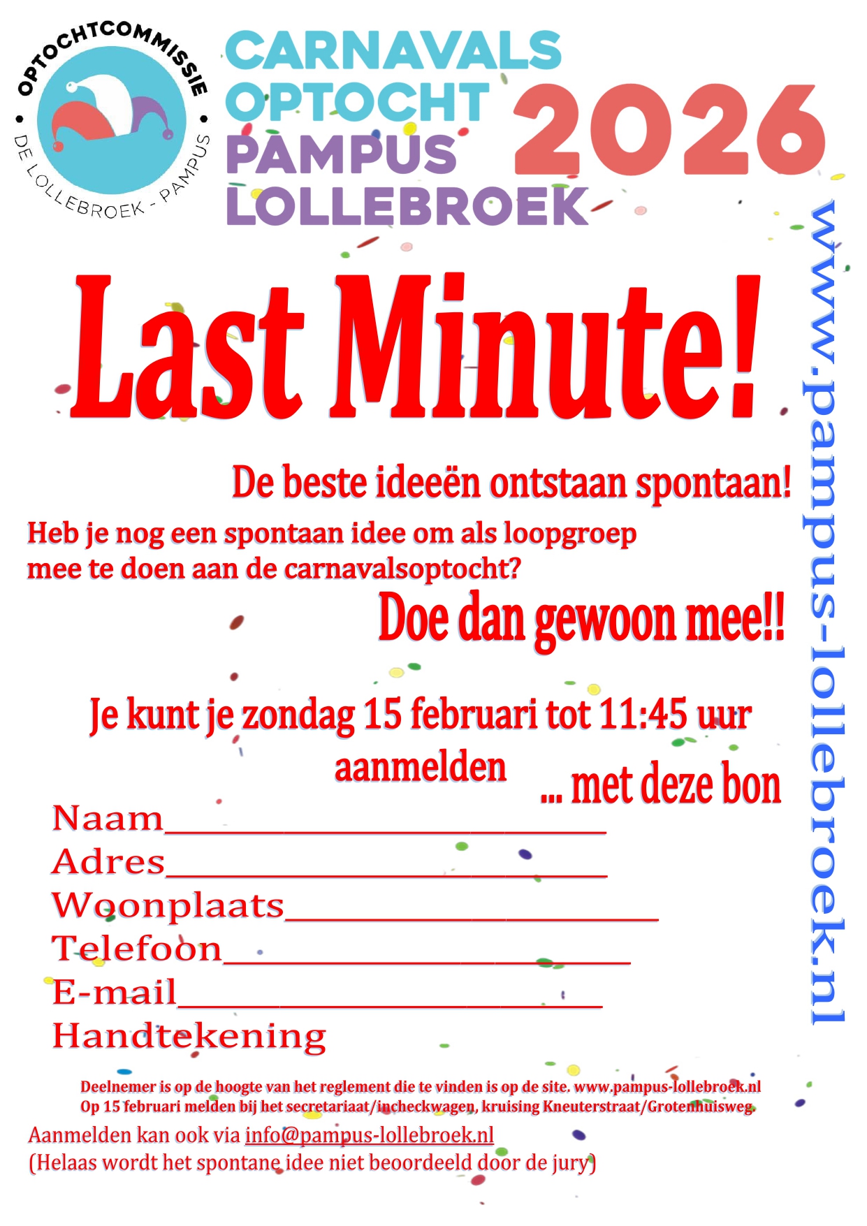 Met behulp van dit formulier kunt u zich tot zondagmiddag 15 februari 11:45 uur nog inschrijven/aanmelden voor de carnavalsoptocht van 2026.